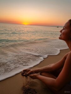 Die Wellen umspülen meine Füße, während der feine Sand durch meine Finger rinnt. Die Sonne küsst spielerisch meine Haut und der Wind flüstert mir zärtlich zu: Du bist genau dort, wo du sein sollst. Ich atme die salzige Meeresluft ein und genieße diesen Augenblick der Ruhe, Stille und Wärme. Ja, all das habe ich mir, verdient.