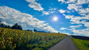 Hier stehe ich, ganz still, und bin fasziniert von diesem Anblick. Die Sonne steht hoch am Himmel, und es duftet bereits nach Herbst. Doch noch strecken die Sonnenblumen ihre Köpfe der Sonne entgegen. Mein Herz wird warm, und flüstert leise: „Hier bist du richtig“.
